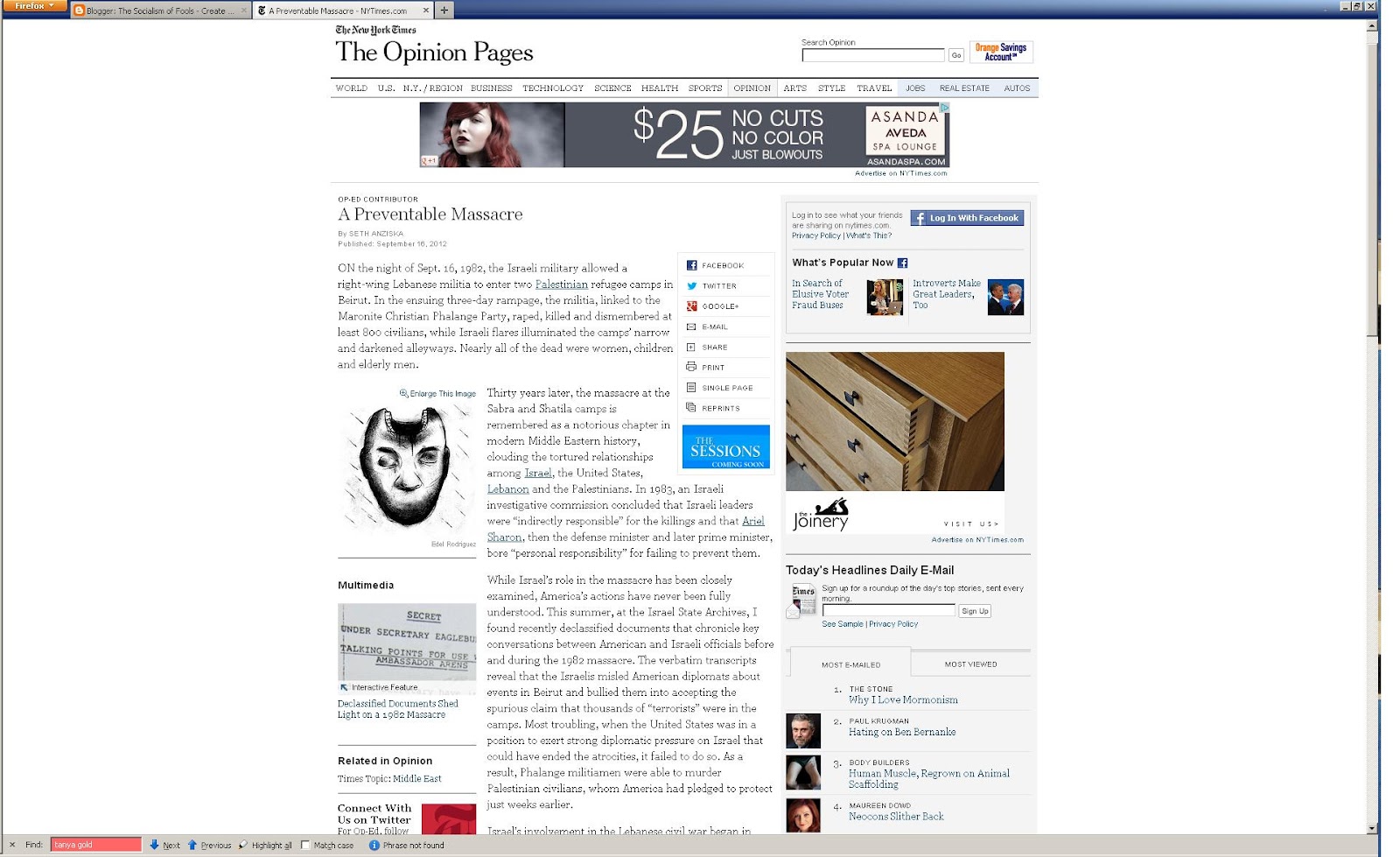 The Optics, or How It Works Liberalism today, on Rosh Hashanah, 2012: the New York Times runs a protege of Rashid Khalidi, who reaches deep into the candy bag of Israel's crimes and dredges up the worst of them all -- the Sabra and Shatila massacre -- to depict the Jewish state as amoral, dishonest and hysterical so as to undercut its security concerns about Iran. While the stakeholders deliberate how to wring the most use out of this, Maureen Dowd's "Neocons Slither Back" pulses like a red lamp in the Most E-Mailed sidebar. Labels: illiberal liberals, neocons |